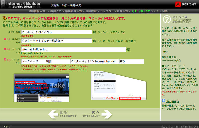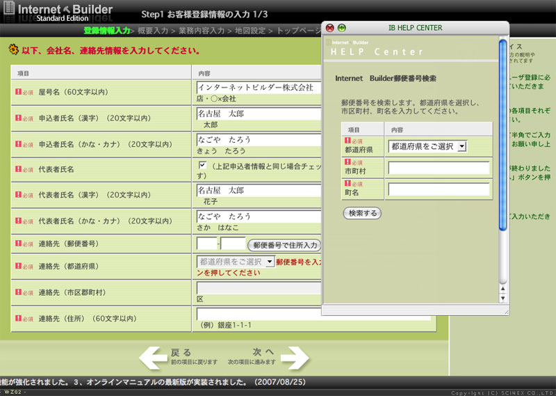 インターネットビルダーでは「作成ガイド」と呼ばれるホームページ作成画面でホームページを作成していきます。作成ガイドは始めの作成の時だけつかいます。作成ガイドの前半は、主に登録情報や住所情報を記入します。