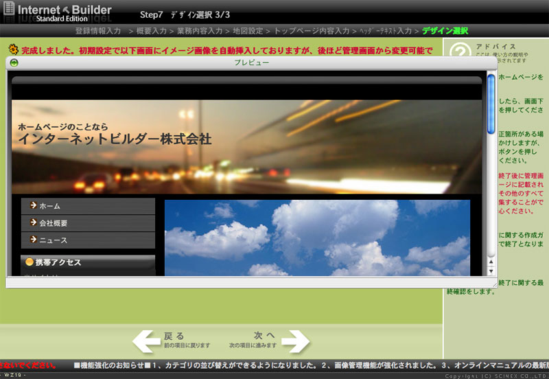 作成ガイド最後の仕上げとして、ホームページのデザインを選択します。これまで作成されたコンテンツのイメージと一番あうデザインテンプレートを選択してください。デザインの種類は数百種類ご用意していますが、カテゴリ別に分類されており、選択しやすくなっています。あせらず、じっくりと、お好きなデザインを選択してください。